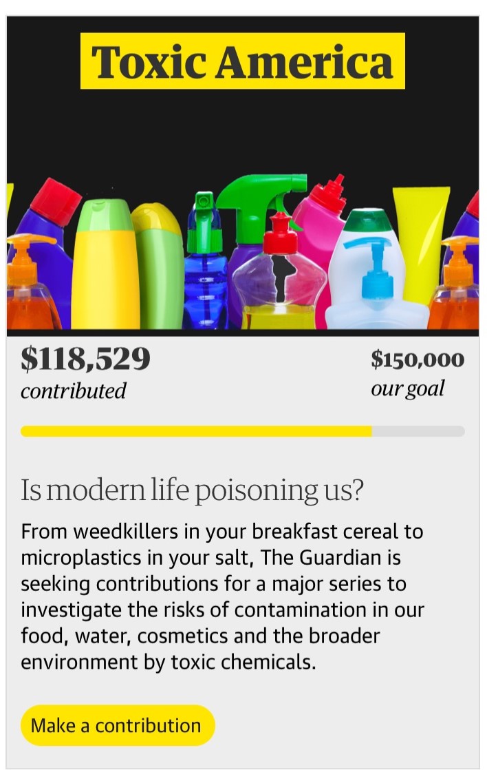 A perfect example of the latter is the campaign undertaken by The Guardian, a left-leaning daily British publication. The newspaper apparently thinks it can gain attention by “attacking” the United States on environmental issues, beginning with its May 22, 2019 edition. They announced, “Why The Guardian is launching a major reader-funded project on the toxicity of modern life,” stating “from pesticides in our produce to toxic dyes in cosmetics, Toxic America is an ambitious new series to investigate the health risks from exposure to chemicals in our everyday lives.” The newspaper hopes to raise $150,000 to fund a series of reports so it can educate the American people on their supposedly awful and toxic lives, as “gaps in the US regulatory system mean untested chemicals legally enter food, cosmetics and other consumer products in the US, and make their way into our soil and water.” According to a June 18, 2019 screen shot, the paper has raised $118,529.