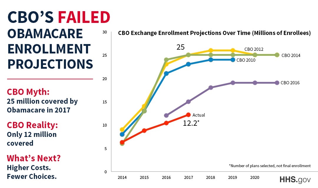 The Affordable Care Act (ACA), or Obamacare, is collapsing and never lived up to its expectations. Its supporters refuse to acknowledge these facts. For example, a chart produced by the Department of Health and Human Services (HHS) demonstrates that in 2014, the CBO predicted that 25 million people would be covered by Obamacare in 2017. The actual coverage is 12.2 million, a miscalculation of 100 percent! Health insurers are leaving the state exchanges in droves, with one-third of all counties in the U.S. having either one or no insurer available to their citizens.